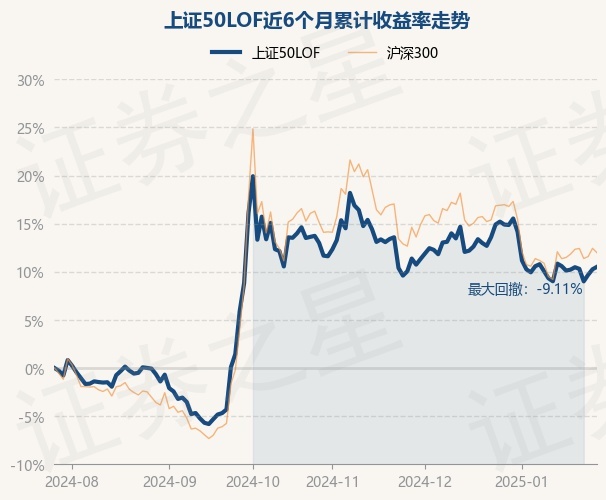 本站消息,1月27日,上证50LOF最新单位净值为1.0543元,累计净值为1.0783元,较前一交易日上涨0.23%。历史数据显示该基金近1个月下跌3.79%,近3个月下跌2.74%,近6个月上涨10.51%,近1年上涨14.69%。该基金近6个月的累计收益率走势如下图: